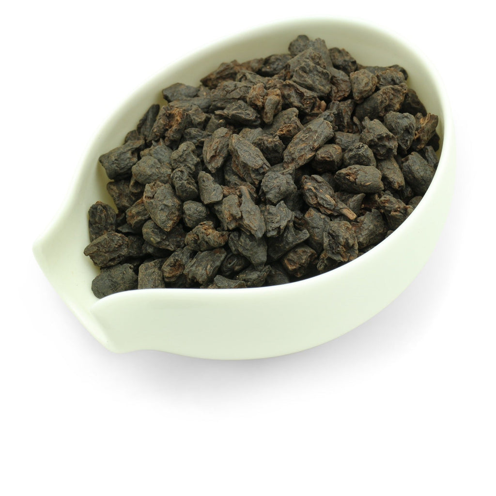 If the small, naturally forming clumps of Shu Pu'er called Lao Cha Tou (老茶头; literally "old tea head") are likened to gold nuggets, then these Cha Hua Shi (茶化石; "tea fossils") must surely be the equivalent of diamonds—luckily, they are much more affordable! The small, slightly shiny, and super-hard tea pebbles rarely appear on the European market, even though they have a lot to offer. The dry aroma is reminiscent of our Nuomi Xiang Hong Cha, but with a strong sweetness added to the sticky rice note. When hit by water, this sweetness becomes even more prominent, very much reminiscent of Vanillekipferl (a traditional German/Austrian vanilla-flavored Christmas cookie). Unsurprisingly, the taste is a mix of slightly salted cookie dough, vanilla, and sticky rice. Finally, it should be noted that these tea fossils are almost immortal—you’ll likely give up before they do! You could even try boiling them on the stove to extract even more of their sweet, creamy goodness.